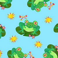 Charming frogs sitting on lily pads lie in wait as they eye nearby dragonflies in hungry anticipation. Larger frogs are about 1-1/2", 'Spotted Frogs' from the 'Colorful Aquatic World' collection by Melanie Mikecz for Michael Miller Fabrics.