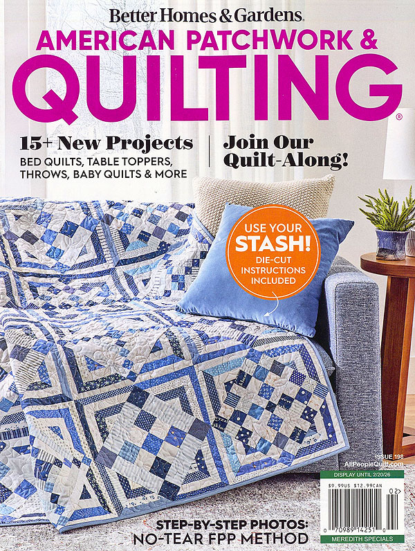 In this issue of American Patchwork & Quilting - browse 15 new projects including bed quilts, table toppers, throws, baby quilts & more; Join the new Quilt-Along series and find ways to use your stash! Projects include: Precut Challenge by Jessica Rose & Kiley Ferons; Barn Stormer by Katie Hennagir; Candy Boxes by Heather Davis; True Blue by Lissa Alexander; Hearts Entwined by Debora Rivera; Stamp Collection by Sue Pfau; Lover's Knot by Jessica Halpin; Window Panes by Kathleen Berlew; Cookies & Cream by Lissa Alexander; Stitch & Gift by Jessie Zeigler & Linda Lum DeBono. American Patchwork & Quilting Magazine, Issue 198, February, 2026.