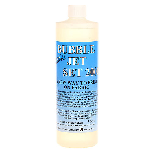 Bubble Jet Set 2000 allows you to print color images on fabric and retain the soft hand of the original fabric - will work with any printer (including HP printers) that uses ink jet or bubble jet technology. Soak the fabric in the bubble jet set solution for 5 minutes - allow to dry 30 minutes. Then iron treated fabric to the shiny side of freezer paper. Once this is completed feed the fabric through your printer exactly like a sheet of paper. Use on 100% cotton or 100% silk (white or ivory). Results vary due to density and quality of fabric, and type of ink used in printer. Wash once to set color (repeated washing will fade image). Liquid can be reused for several soakings. 20-25 sheets can be made per bottle. Use rubber gloves with BJS 2000. An inexpensive way to put your color photos/images on fabric! Bubble Jet Set 2000, 16 oz.