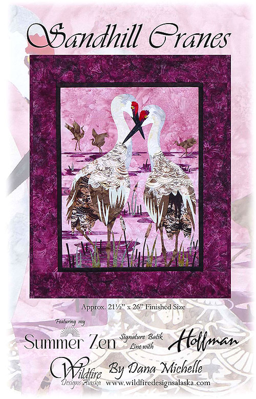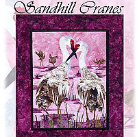 Majestic cranes standing in the shallow waters, reeds and cattails of their home create this lovely wall-hanging. Material Requirements include: 1/2 yd Pink Ombre for Background; 1/2 yd Dk Plum on Cranes, Outer Border & Binding; 1/8 yd Med Plum for Water; Dk Brown on Cranes; 1/4 yd Tan on Cranes; 1/8 yd Off-White on Cranes; 1/8 yd Med Brown on Cranes; 1/8 yd Dk Brown on Cranes and Inner Border; 1/8 yd White on Cranes; 1/8 yd Lt Gray on Cranes; 1/8 yd Red on Cranes; 1/8 yd Dk Gray on Cranes; 1/8 yd Gold for Crane Eyes; 1/8 yd Blue or Green for reeds and Cattails; 1 yd Batting & Backing; 1 yd Lite Steam-a-Seam 2 Fusible web (eQuilter product: WAST5424). 'Sandhill Cranes' quilt pattern by Dana Michelle of Wildfire Designs Alaska, finished size is about 21-1/2" x 26".