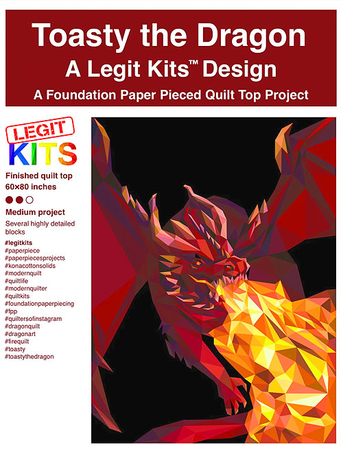 Go on a quilting adventure to construct Toasty the Dragon using foundation paper piecing. This is one of Legit Kits medium difficulty projects with several highly detailed blocks, creating a challenging yet very addictive, project. The pattern walks you through the process with a complete user's guide including color map, color gradient list, color code list, assembly guide, cutting guide, and foundation paper pieces. Use up your solid stash as this richly colored red dragon requires scraps in a range of 65 different colors. 'Toasty The Dragon' paper piecing quilt pattern by Legit Kits. Finished size is about 60" x 80".