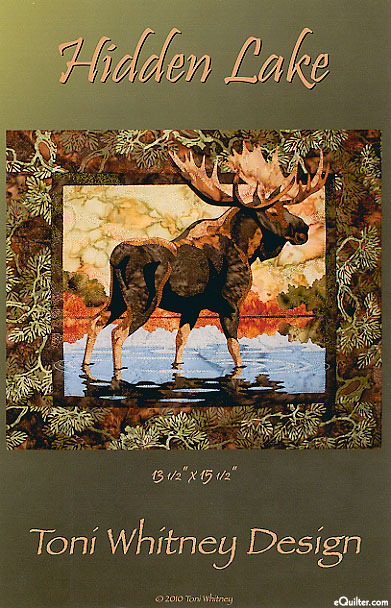 As if captured with a telescopic lens this moose will be a great addition to your existing artwork. This is a wonderful pattern to showcase vibrant batiks and hand-dyes! Fabric requirements include a variety of pieces no larger than 7" x 12" for moose, reflection in the water and scenery; 9 3/4" x 12" for background; 1/3 yd for border and binding; 18" x 20" for backing; 18" x 20" of low loft batting; 16" x 27" of Lite Steam A Seam; 12" x 13" piece of clear vinyl. 'Hidden Lake' pattern by Toni Whitney Design, finished pattern is about 13 1/2" x 15 1/2".