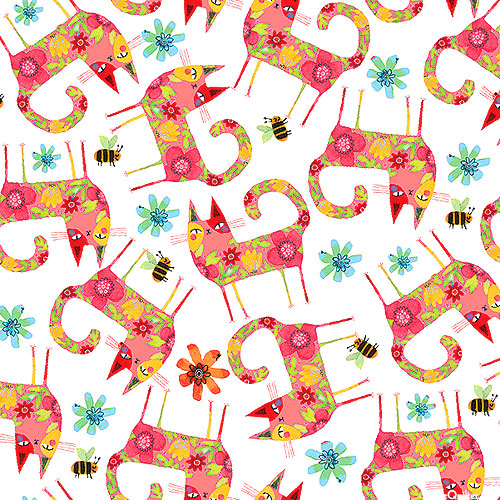 Digitally printed, larger cats are about 1", 'Patterned Cats' from the 'Garden Cats' collection by Terry Runyan for Benartex.