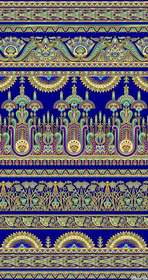 Marvel in admiration at the exquisite elegance evoked by this collection of art relics from a bygone era - the wealth of fine detail and vividly rich colors lending an ancient allure to this fabulous striped fabric. Wider stripes are about 5-1/2", stripes run the length of the fabric, with gold metallic, from the 'Ancient Beauty' collection by Studio RK for Robert Kaufman Fabrics.