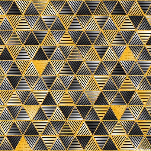 Marvel in admiration at the exquisite elegance evoked by this stunning geometric design from a bygone era - the wealth of fine detail and vividly rich colors lending an ancient allure to this fabulous fabric. Triangles are about 1/2", with gold metallic, from the 'Ancient Beauty' collection by Studio RK for Robert Kaufman Fabrics.