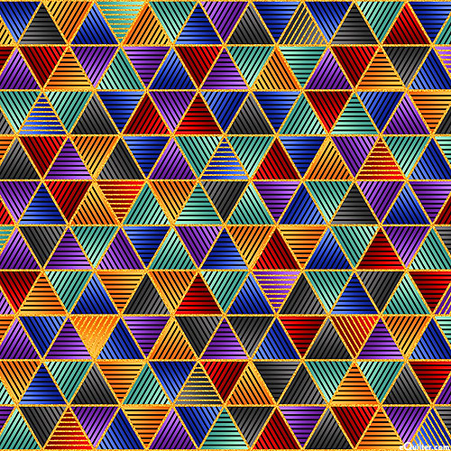 Marvel in admiration at the exquisite elegance evoked by this stunning geometric design from a bygone era - the wealth of fine detail and vividly rich colors lending an ancient allure to this fabulous fabric. Triangles are about 1/2", with gold metallic, from the 'Ancient Beauty' collection by Studio RK for Robert Kaufman Fabrics.
