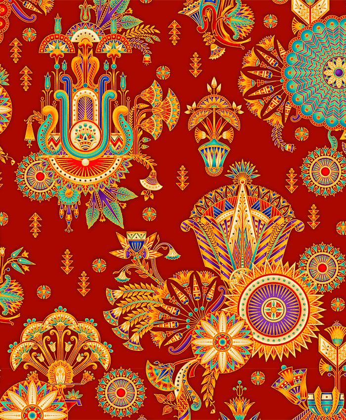 Marvel in admiration at the exquisite elegance evoked by this collection of art relics from a bygone era - the wealth of fine detail and vividly rich colors lending an ancient allure to this fabulous fabric. Larger motifs are about 8-1/4", with gold metallic, from the 'Ancient Beauty' collection by Studio RK for Robert Kaufman Fabrics.