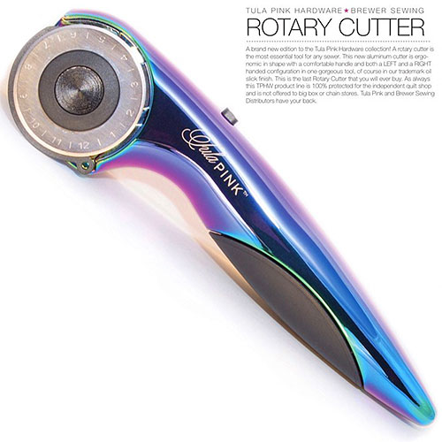Tula Pink's 45mm Ergonomic Rotary Cutter is both stylish and effective. The curved handle helps to make clean cuts with even pressure. Stay safe with its secure locking blade guard, for safe use and storage. Designed for right and left handed use. Its carbon alloy steel blade cuts fabric, leather, paper, vinyl and more.