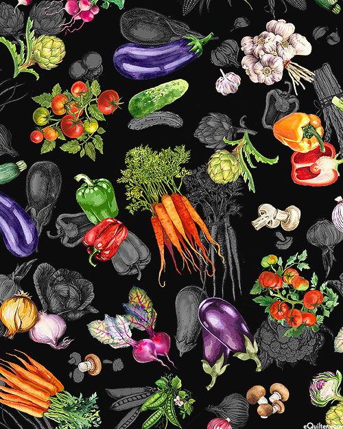 With some grayed out and others colored, a collection of various vegetables are scattered across the design including eggplants, cabbages, tomatoes, artichokes, broccoli, turnips, carrots, onions, peas, mushrooms, radishes, and asparagus. Digitally printed, larger vegetables are about 4-1/4", 'Farm Fresh' from the 'Fresh and Local' collection by Michael Miller Fabrics.