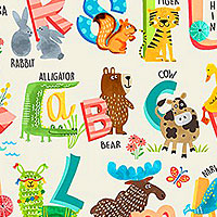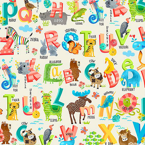 Larger animals are about 3", 'Alphabits Allover' from the 'Alphabits' collection by Michael Miller Fabrics.
