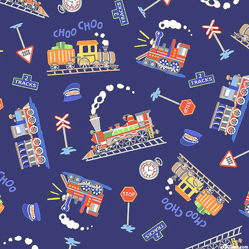 Larger trains are about 3", 'Stop. Look. Listen.' from the 'Whistle Stop Tour' collection by Michael Miller Fabrics.