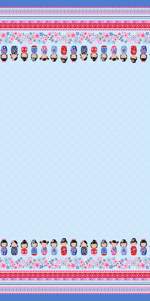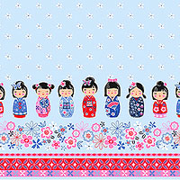 Double border stripe, dolls are about 2-1/4" tall, 'Kokeshi Doll Border' from the 'Doll Festival' collection by Michael Miller Fabrics.