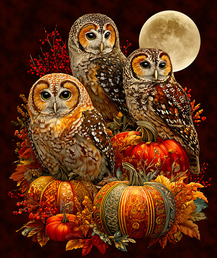 In this panel, a trio of handsome owls perch atop a bountiful harvest spread of pumpkins and other Autumnal motifs as a full moon beams high in the sky overhead. Digitally printed, 36" panel, 'Harvest Owls' by the Rubin Design Studio, designed exclusively for eQuilter.