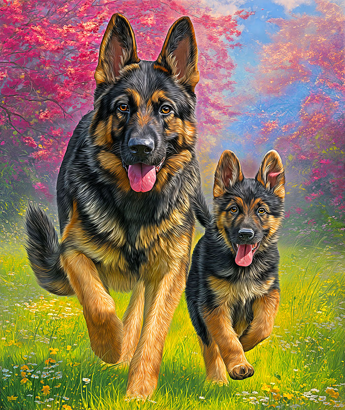 An adorable duet of two German Shepherds are seen running through a flowery field as colorful leaves flutter gently overhead in this picturesque panel. Digitally printed, 36" panel, 'Doggie Duet German Shepherd' by the Rubin Design Studio, designed exclusively for eQuilter.