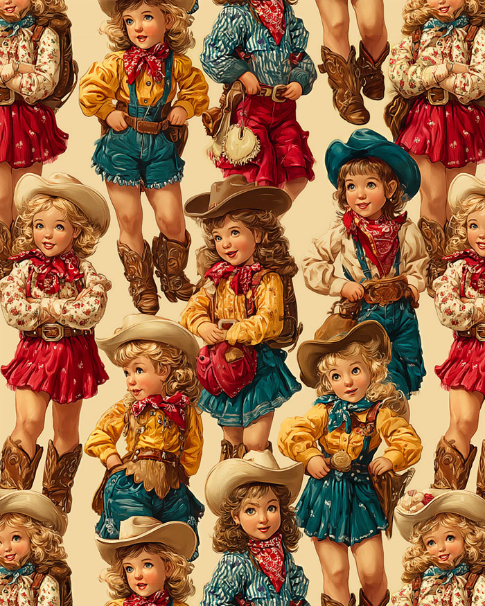 Stylish cowgirls dressed up in adorable Western outfits are depicted in stunning detail across the design. Digitally printed, cowgirls are about 4-1/2" 'Cowgirl Gathering' by the Rubin Design Studio, designed exclusively for eQuilter.