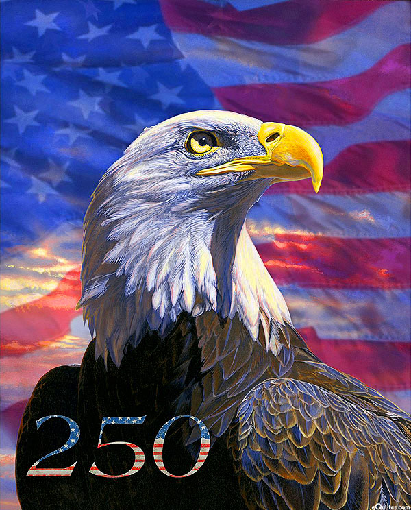 In celebration of the United States Semiquincentennial, a stunning Bald Eagle stands out in vivid detail against a majestic depiction of the American flag in this proudly patriotic panel. Digitally printed, 36" panel, 'USA 250 Eagle 2 Panel' from the 'America 250 Years' collection by Wild Wings & Scot Storm for Four Seasons of David Textiles.