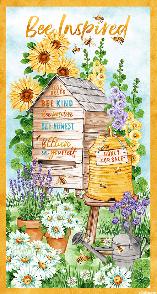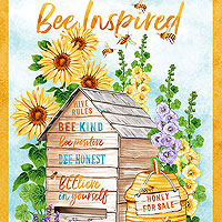 In this panel, a homey beehive with inspirational bee-themed puns sits nestled cozily within a fragrant flower garden. Digitally printed, 24" panel, 'Bee Inspired Panel' from the 'Bee Culture' collection by Michael Miller Fabrics.