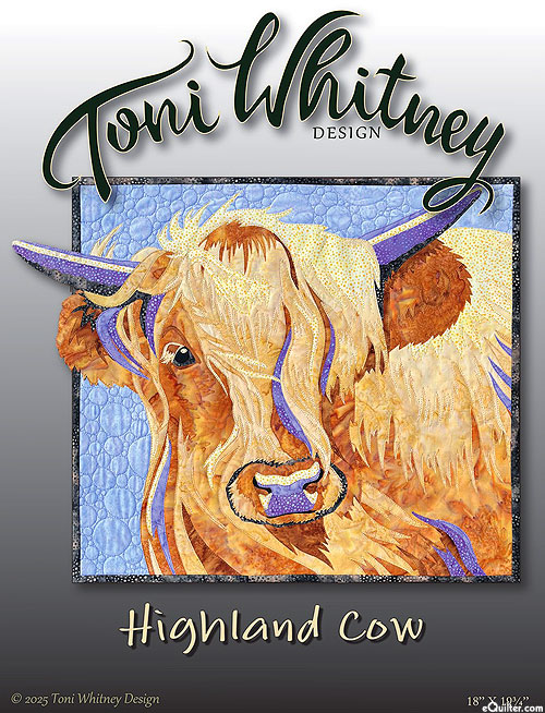 Who can resist a fluffy highland cow peaking out from behind its long forelock? Designed for a raw-edge appliqué, the pattern can be adapted to needle turn as well. A color swatch strip is included to assist you in choosing the exact fabrics! Fabric requirements include: 11" x 12" yellow; 14" x 14" tan; 1/4 yd gold; 1/4 yd orange & gold; 10" x 10" brown; 18-1/2" x 20-1/4" blue for background; 6" x 11" lavender; 7" x 10" purple; 7" x 10" plus 7-1/2" x WOF gray & black for binding/border; 3" x 4" black; 23" x 25" batting; 25" x 27" backing; 2 to 2-1/2 yds Steam-A-Seam 2 Lite fusible web. 'Highland Cow' quilt pattern by Toni Whitney Design. Finished size is about 18" x 19-3/4".