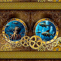 Porthole views of the ocean reveal a stunning array of aquatic animals decorated in gears and steampunk machinery including whales, octopi, and fish. Digitally printed, wider stripes are about 9", stripes run the length of the fabric, from the 'Steampunk Menagerie' collection by Jason Yenter for In The Beginning Fabrics.