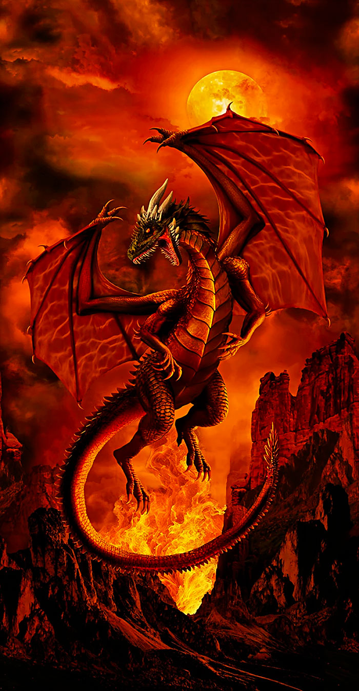 A wicked dragon spreads fear and terror as it soars through a fiery canyon in this picturesque panel. Digitally Printed, 24" panel, 'Dragon Fire Panel' from the 'Dragon Fire' collection by Timeless Treasures.