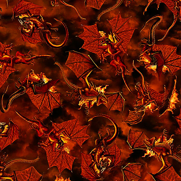 Wicked dragons covered in flames are scattered against a dark and dreary sky in this fantastical print. Digitally Printed, dragons are about 2", 'Dragon Fire Battle' from the 'Dragon Fire' collection by Timeless Treasures.