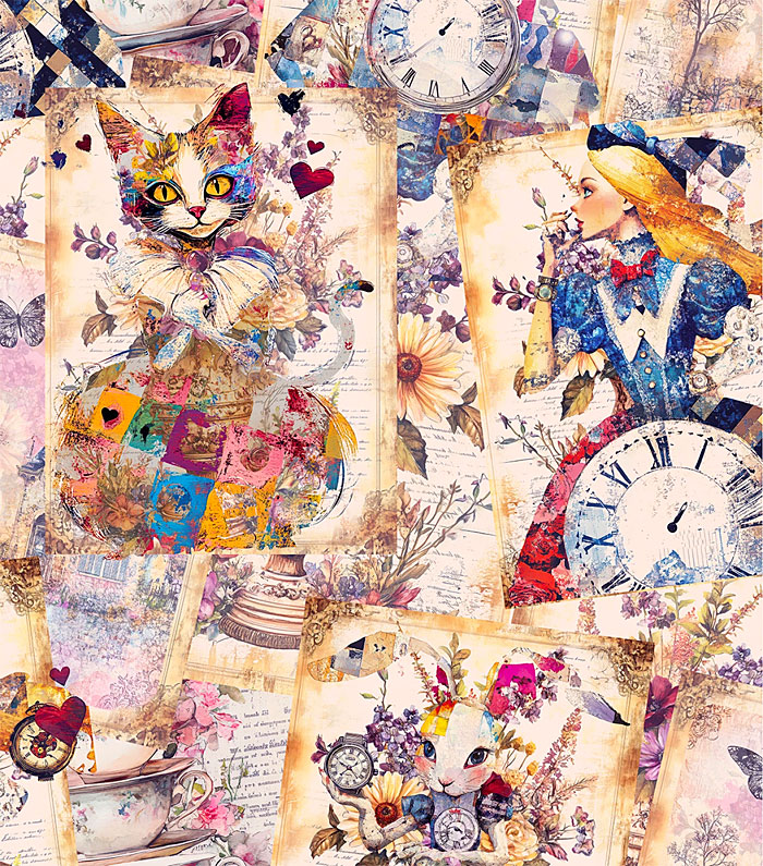 Iconic characters from Lewis Caroll's beloved story, "Alice In Wonderland", come to life in a fantastical collage including Alice, the Cheshire Cat, and Thackery Earwicket. Digitally Printed, Alice in Wonderland frames are about 6", 'Alice's Dream Collage' from the 'Looking Glass' collection by Timeless Treasures.