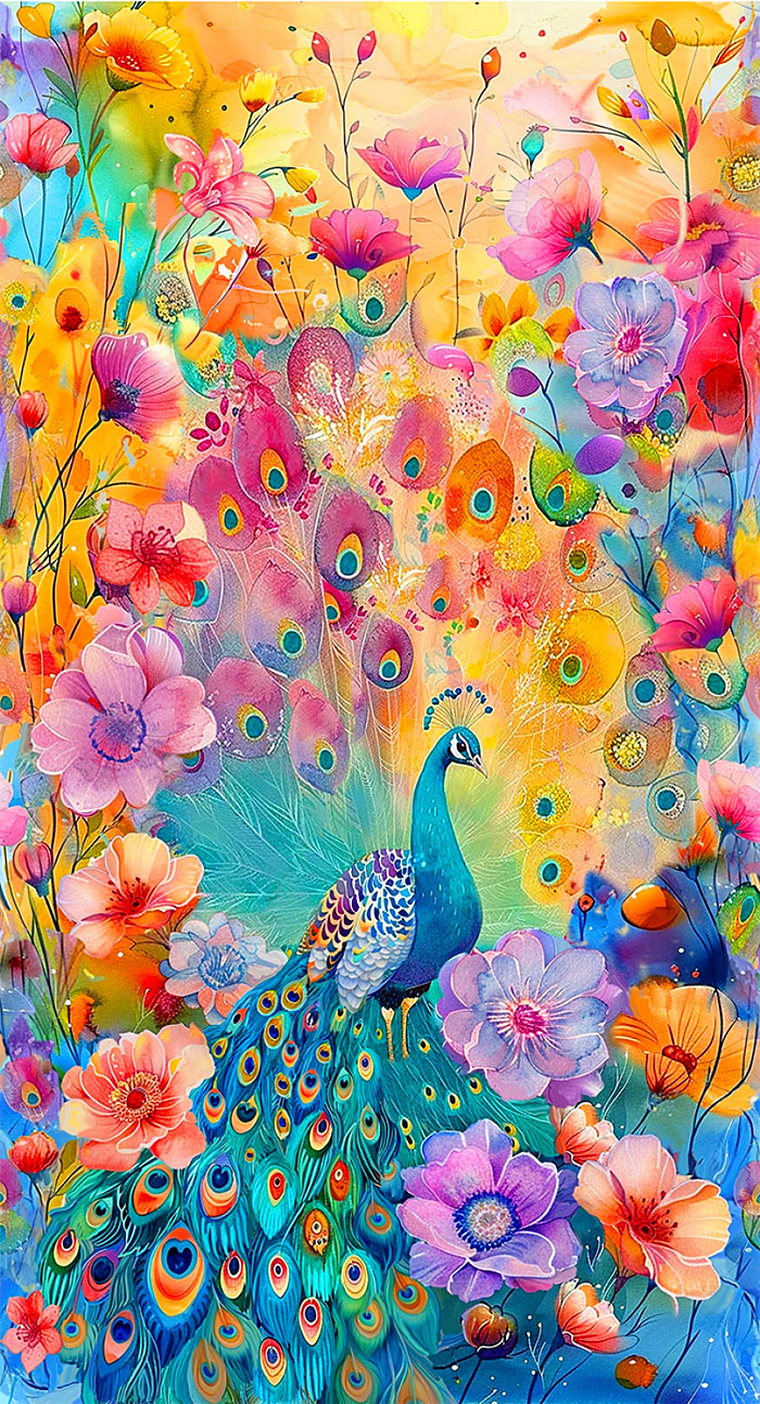 Peacocks lounge amidst a colorful garden blooming with lush florals in this picturesque panel. Digitally Printed, 24" panel, 'Peacock Floral Panel' from the 'Wild Beauty' collection by Timeless Treasures.