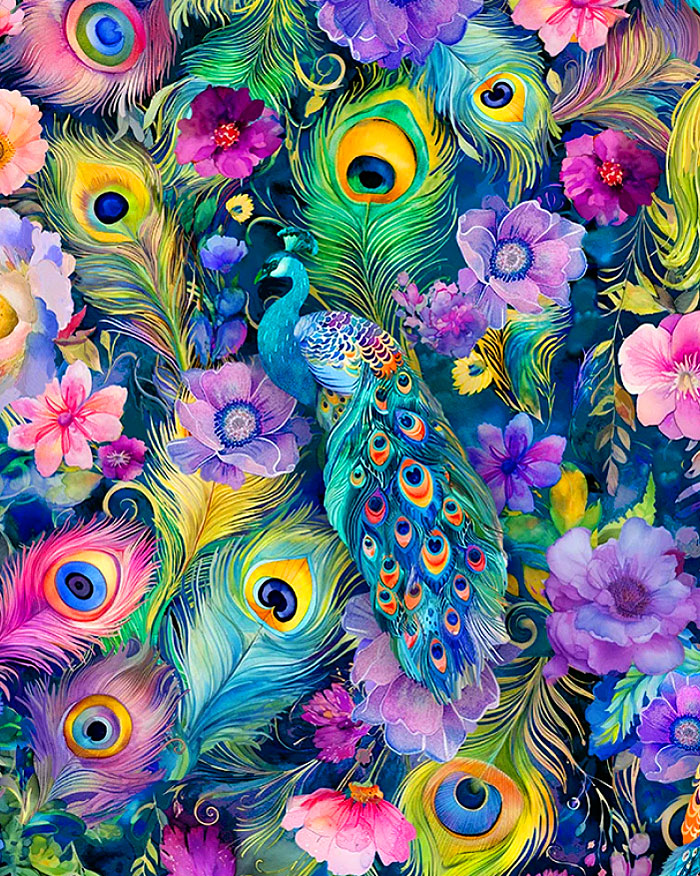 A majestic peacock struts in front of a background of lush florals and vibrant peacock feathers in this vividly colorful design. Digitally Printed, peacocks are about 6", 'Peacock Peek-a-Boo Floral' from the 'Wild Beauty' collection by Timeless Treasures.