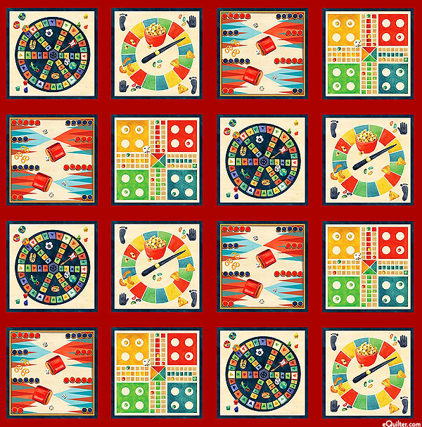 Panel blocks include a fun and nostalgic variety of games twister, ludo, and backgammon. 42" panel, panel has sixteen frames about 9" x 9", 'Board Games' from the 'Game On' collection by Louise Nisbet for Michael Miller Fabrics.