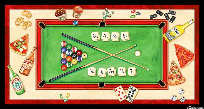 In this panel, a fun spread of treats and sweets are arranged around a pool table including pizza, pretzels, beers, jelly beans, and cupcakes. 24" panel, 'Game Night Panel' from the 'Game On' collection by Louise Nisbet for Michael Miller Fabrics.