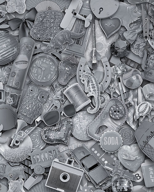 A kitschy spread of various odds and ends are scattered across this dazzling tonal design. Digitally printed, larger objects are about 4-1/2", from the 'Living Color' collection by Aimee Stewart for Michael Miller Fabrics.