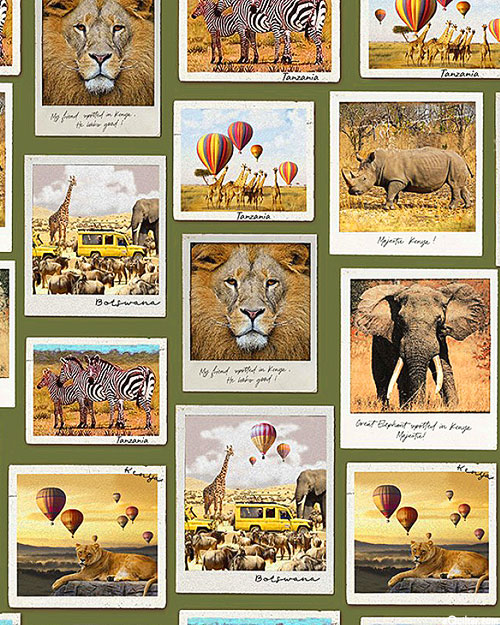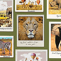 Photographs from safaris across Africa showcase stunning photos of wildlife including elephants, rhinos, lions, zebras, and giraffes. Digitally printed, larger photos are about 3-1/4", 'Safari Album' from the 'Safari' collection by Michael Miller Fabrics.
