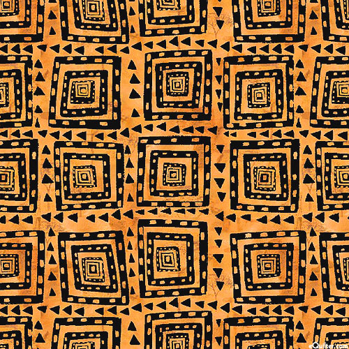 Black geometric squares with shapes in and all around them sit atop a beautifully textured orange background. Larger tiles are about 1", 'Tribal Squares' from the 'From Africa' collection by Louise Nisbet for Michael Miller Fabrics.