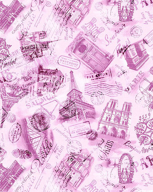 Parisian postage stamps are scattered across the design showcasing a wide variety of French tourist sites including the Eiffel Tower, the Cathédrale Notre-Dame de Paris, Champs-Élysées, and the Louvre. Digitally printed, larger buildings are about 2", 'Silhouettes De Paris' from the 'We'll Always Have Paris' collection by Michael Miller Fabrics.