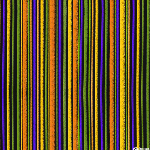 Bright colors run the length of the design creating a dynamic spectrum of hue across this energetic stripe. Digitally printed, wider stripes are about 1/4", stripes run the length of the fabric, from the 'Steampunk Halloween 3' collection by Desiree's Designs for Quilting Treasures.