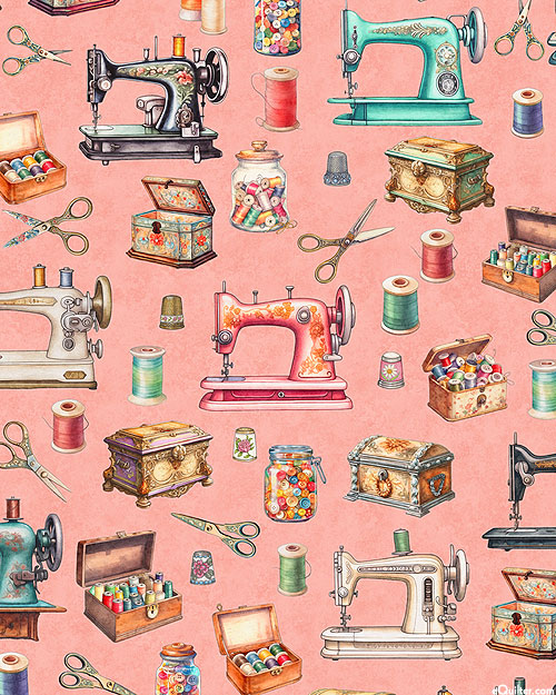 Retro sewing machines lovingly decorated in dainty florals are strewn across this delightful vintage design with buttons and other sewing accessories filling the space between. Digitally printed, larger sewing machines are about 3-1/2", from the 'In Stitches' collection by Dan Morris for Quilting Treasures.