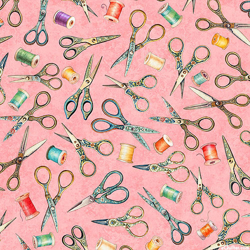 Antique sewing scissors that could have been taken from your grandmother's sewing room are strewn over the design with spools of thread tossed between. Digitally printed, larger scissors are about 2-1/2", from the 'In Stitches' collection by Dan Morris for Quilting Treasures.