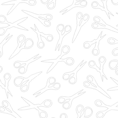 Dotted silhouettes reveal the shapes of various sewing scissors scattered across a solid background. Digitally printed, larger scissors are about 2", from the 'In Stitches' collection by Dan Morris for Quilting Treasures.