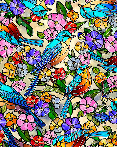 Charming birds perch within a vibrant floral landscape composed of stunning stained glass tiles. Digitally printed, larger birds are about 5", from the 'Sunlit Birds' collection by JQ Licensing for Quilting Treasures.