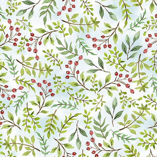 Leafy sprigs laden with berries are scattered against a mottled background. Digitally printed, larger branches are about 1-3/4", from the 'Drawn To Birds' collection by Jane Maday for Quilting Treasures.