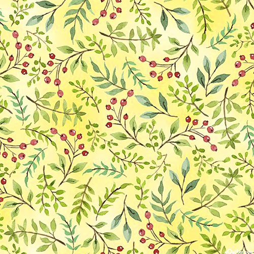 Leafy sprigs laden with berries are scattered against a mottled background. Digitally printed, larger branches are about 1-3/4", from the 'Drawn To Birds' collection by Jane Maday for Quilting Treasures.