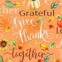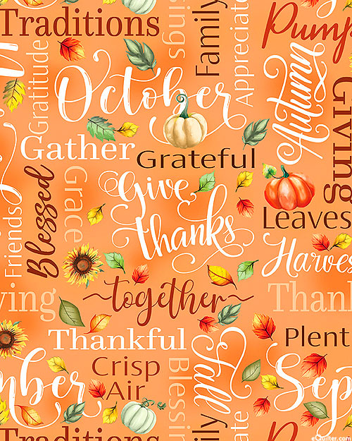 Harvest slogans and other Thanksgiving-themed motifs including pumpkins, turkeys, apples, and acorns lend an Autumnal allure to this charming design. Taller text is about 2", 'Thankful Words' from the 'Give Thanks' collection by Nicole DeCamp for Benartex Fabrics.