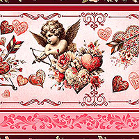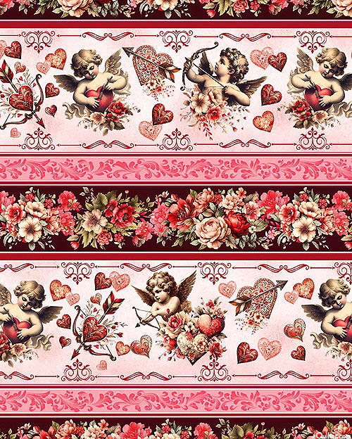 Between the layers of this striped design are depictions of baby cupid firing his arrows of love as intricate hearts and floral bouquets fill the surrounding stripes. Wider stripes are about 5-1/4", stripes run the length of the fabric, 'Cupid's Arrow Stripe' from the 'Cupid's Arrow' collection by Nicole DeCamp for Benartex Fabrics.