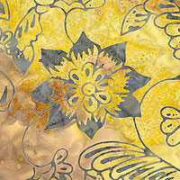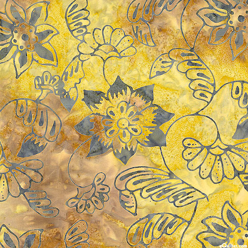 A lush landscape of flourishing florals are depicted in vivid hues within mottled batik textures. Batik, larger flowers are about 3-1/2", 'Solo Floral' from the 'Bali Rumba' collection by Benartex Fabrics.