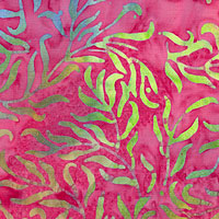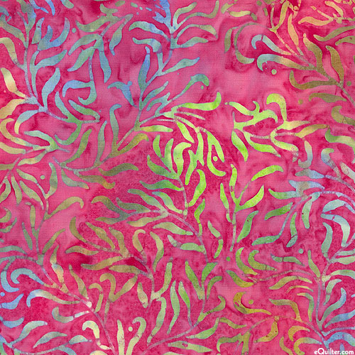 A lush landscape of leafy fronds are depicted in vivid hues within mottled batik textures. Batik, larger leaves are about 1", 'Jasmine' from the 'Bali Salsa' collection by Benartex Fabrics.