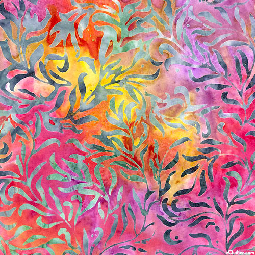 A lush landscape of leafy fronds are depicted in vivid hues within mottled batik textures. Batik, larger leaves are about 1", 'Jasmine' from the 'Bali Samba' collection by Benartex Fabrics.