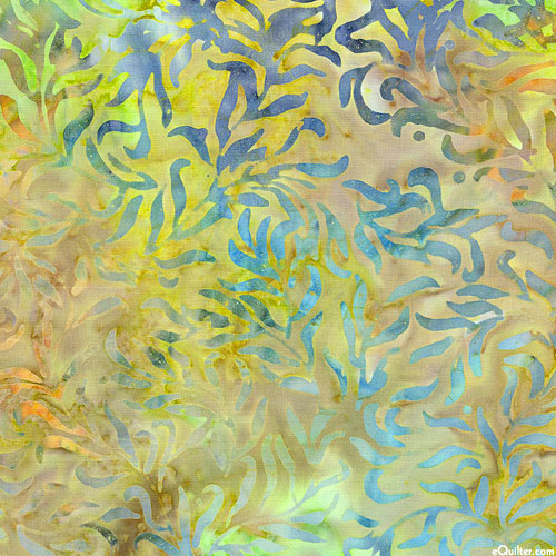 A lush landscape of leafy fronds are depicted in vivid hues within mottled batik textures. Batik, larger leaves are about 1", 'Jasmine' from the 'Bali Rumba' collection by Benartex Fabrics.