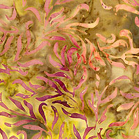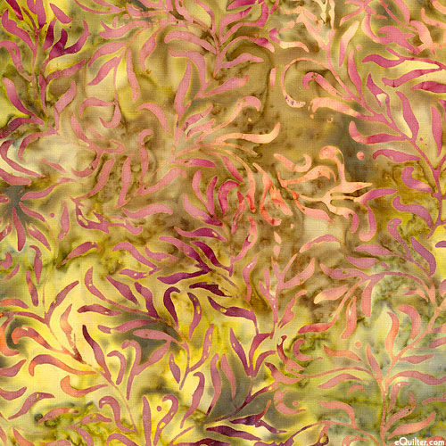 A lush landscape of leafy fronds are depicted in vivid hues within mottled batik textures. Batik, larger leaves are about 1", 'Jasmine' from the 'Bali Rumba' collection by Benartex Fabrics.