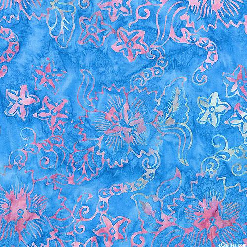 A lush landscape of flourishing florals are depicted in vivid hues within mottled batik textures. Batik, larger flowers are about 3", 'Star Flower' from the 'Bali Samba' collection by Benartex Fabrics.