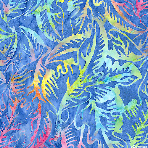A lush landscape of leafy fronds are depicted in vivid hues within mottled batik textures. Batik, larger leaves are about 6", 'Banana Leaf' from the 'Bali Samba' collection by Benartex Fabrics.